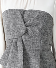 胸元のねじりディテールが立体感を生み、ペプラムシルエットが女性らしい印象に導きます。