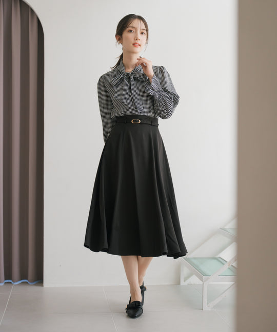 フロントジップと配色パイピングがアクセントになったロングスカート。