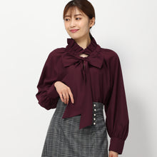 大きなボウタイとフリル襟で愛らしさたっぷりに仕上げたブラウス。